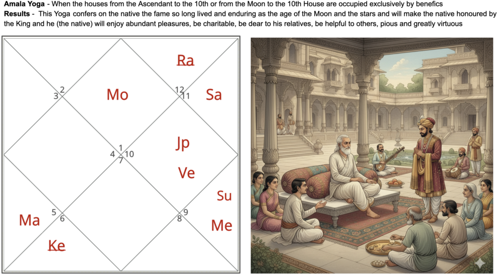 In the Vividha Yoga chapter of Bṛhat Parāśara Horā Śāstra, Amala Yoga is formed when a benefic planet occupies the 10th house from the Lagna or from the Moon. Parāśara describes this yoga as producing pure conduct, lasting fame, good reputation, and professional distinction, with one’s actions remaining untainted in public life. Its strength depends on the benefic’s dignity and freedom from affliction, which determine the visibility and durability of its results.
